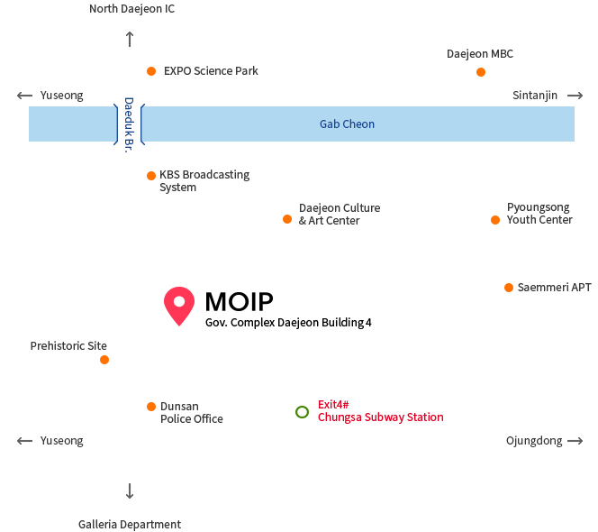 Take the Honam or Kyungbu Expressway and exit at the North Daejeon Interchange. From the toll gate, turn left and you will see signs indicating the way to the Government Complex. As you continue going straight, you will pass the EXPO Science Park and KBS on your left and the National Science Museum on your right. After passing KBS, turn left and you will then see the Daejeon Municipal Museum of Art on your left. At the first intersection (you will see the Pyoungsong Youth Center in front of you), turn right and go straight until you see the Saemmeori Apartment Complex on your left. At the first traffic signal, turn right again to enter the East Gate of the Government Complex on your right to reach KIPO.