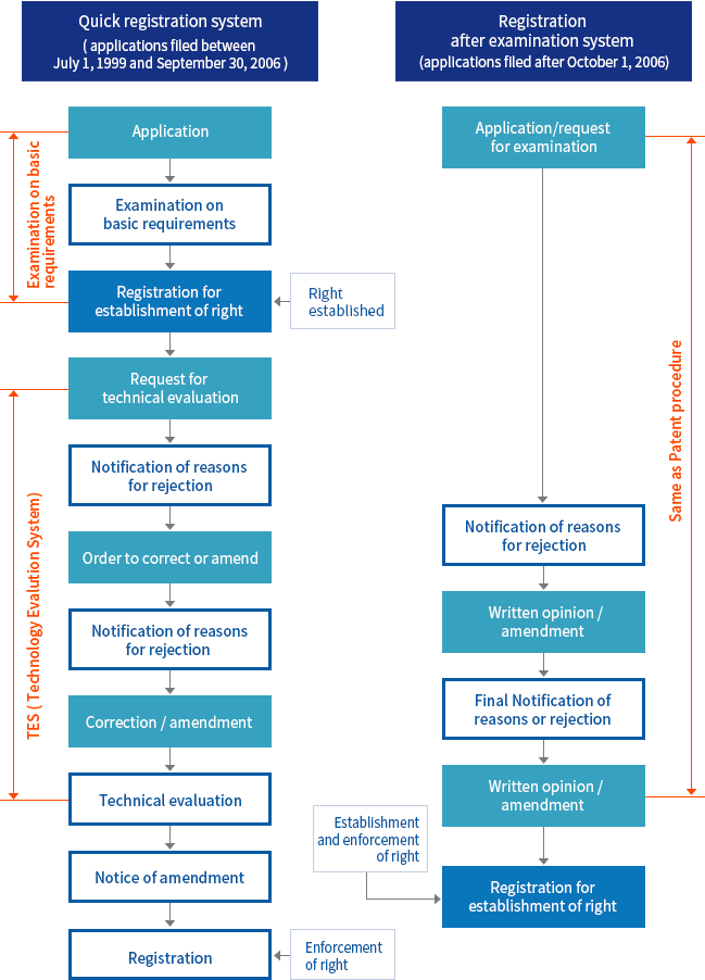 After the repeal of the quick registration system of the utility model, which examined only the formality and basic requirements of the application, the registration after examination system was introduced so that examiners would consider the registration of a utility model only after substantive examination. The procedure of the quick registration system such as the basic requirements examination, the TES (Technology Evaluation System) after examination, and the request for correction system were all repealed. An examination procedure similar to the patent system including request for examination, official notification of reasons for rejection, and an amendment was introduced.