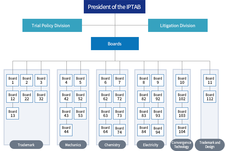 As shown in the organizational chart below, the IPTAB consists of 36 Boards, a trial policy division and a litigation division under the leadership of the President of the IPTAB. Each Board is managed by a chief presiding administrative judge and hears and decides trial and appeal cases with different technical fields. Trial policy division is a Board operations division which supports and administers proceedings and hearings and also conducts formalities examination, trial quality evaluation, etc. Litigation Division defends The IPTAB decisions before the Court for cases in which the Commissioner of the KIPO is the defendant.